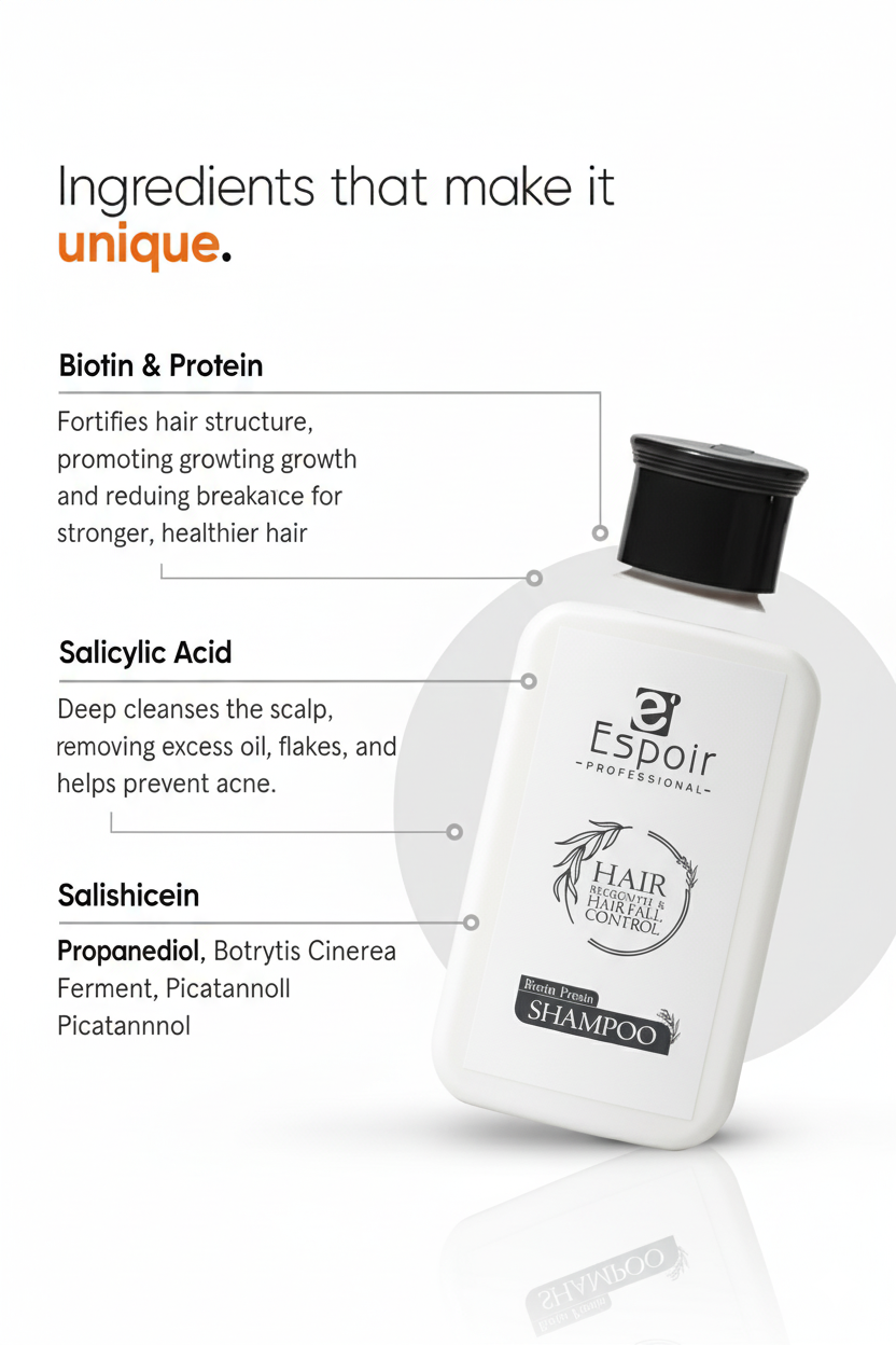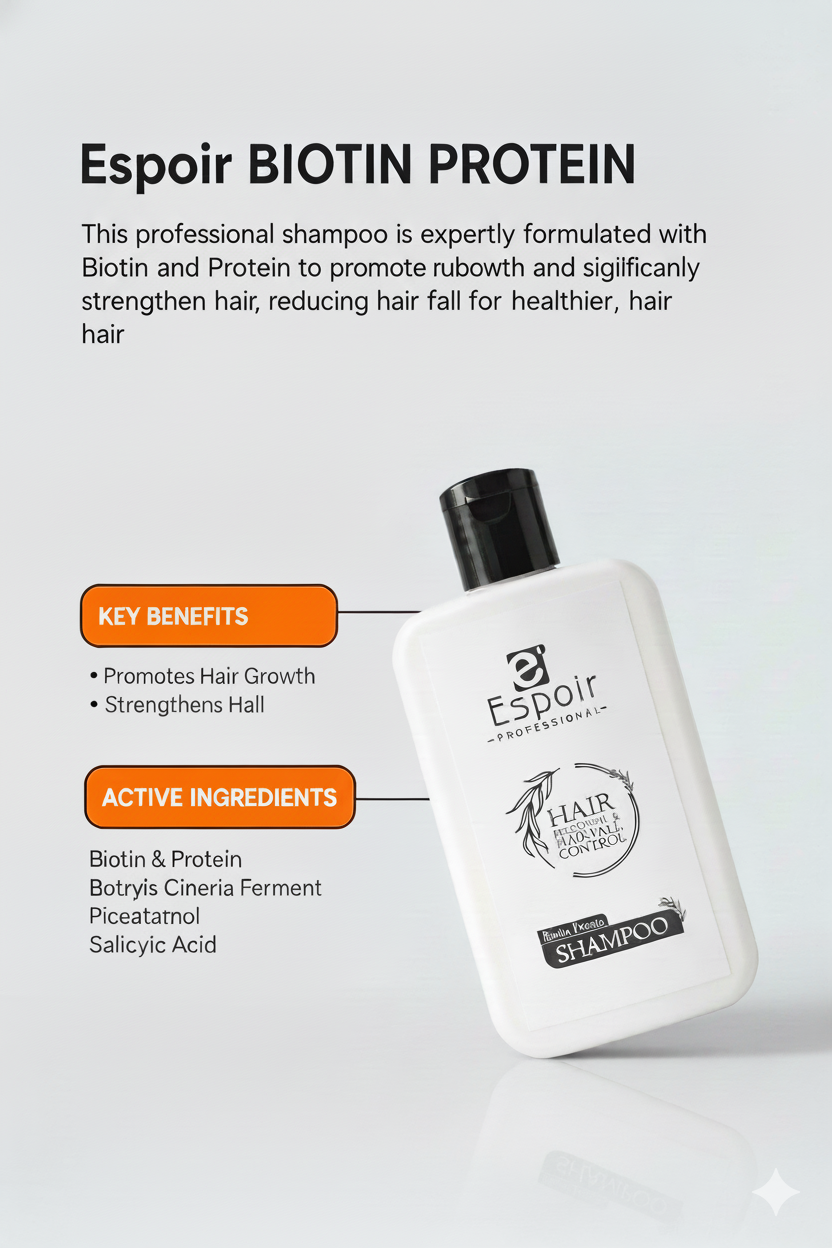 The Espoir Biotin Protein Shampoo is a specialized hair care solution designed to leverage the benefits of biotin and protein for enhanced hair health. Its potent formula includes key ingredients such as Propanediol, Botrytis Cinerea Ferment/Enact Lystate Filtrate, Piceatanne Olosanolamine, and Salicylic Acid, which contribute to a comprehensive cleansing and scalp care experience. This shampoo is ideal for individuals looking to fortify their hair with protein and address concerns that biotin can help with. For optimal results, users should thoroughly wet their hair, lather a quarter-sized amount of shampoo into their palms, and work it through their hair, focusing on the scalp and lengths while avoiding over-shampooing the tips. A complete rinse with cold water, concentrating on the ends, will leave the hair feeling clean and refreshed.