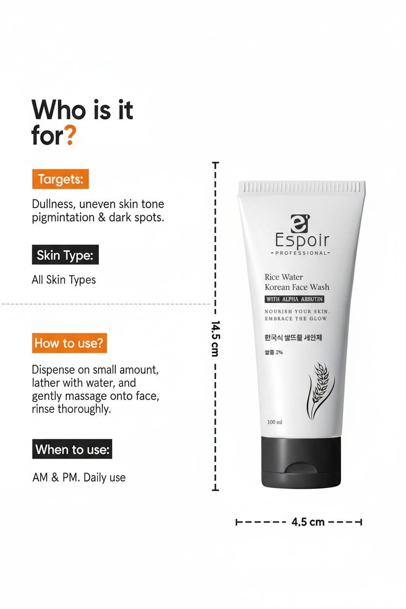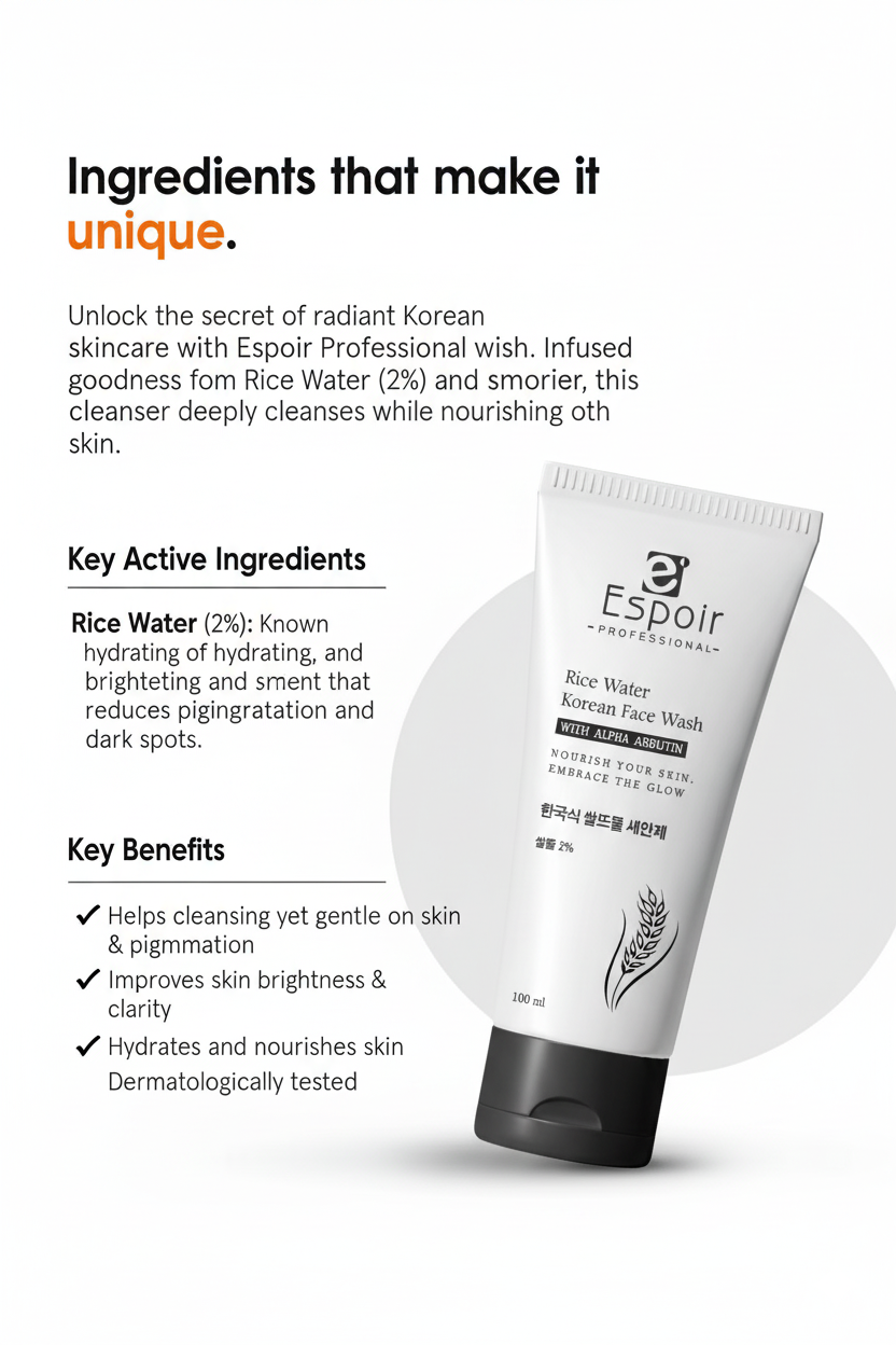 Unlock the secret of radiant Korean skincare with Espoir Professional Rice Water Korean Face Wash. Infused with the natural goodness of Rice Water (2%) and the powerful brightening ingredient Alpha Arbutin, this cleanser deeply cleanses while nourishing your skin.
