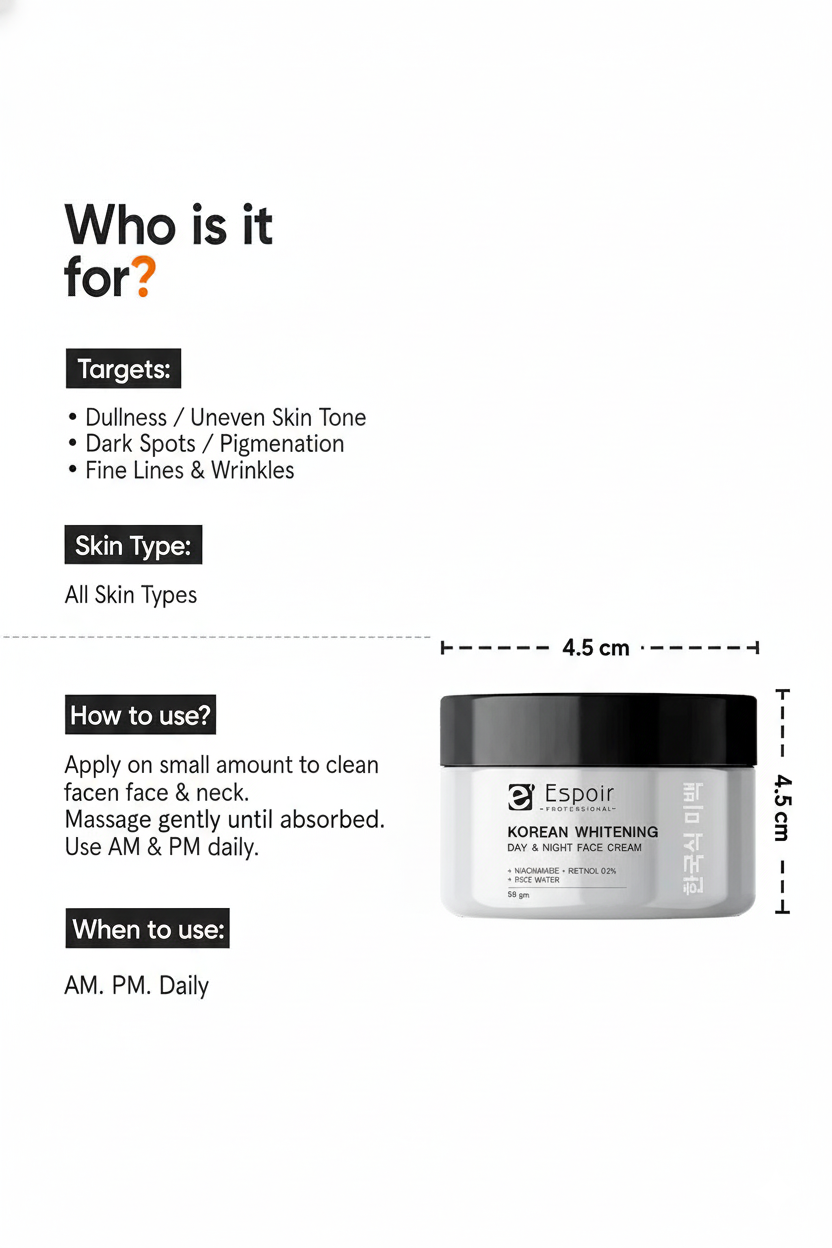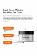 Espoir Korean Whitening Day & Night Face Cream is a luxurious, multi-purpose cream designed to brighten and hydrate your skin. This nourishing cream contains Niacinamide and Retinol, working together to improve skin tone, reduce pigmentation, and prevent signs of aging. Its lightweight formula absorbs quickly, leaving the skin feeling refreshed, soft, and radiant.