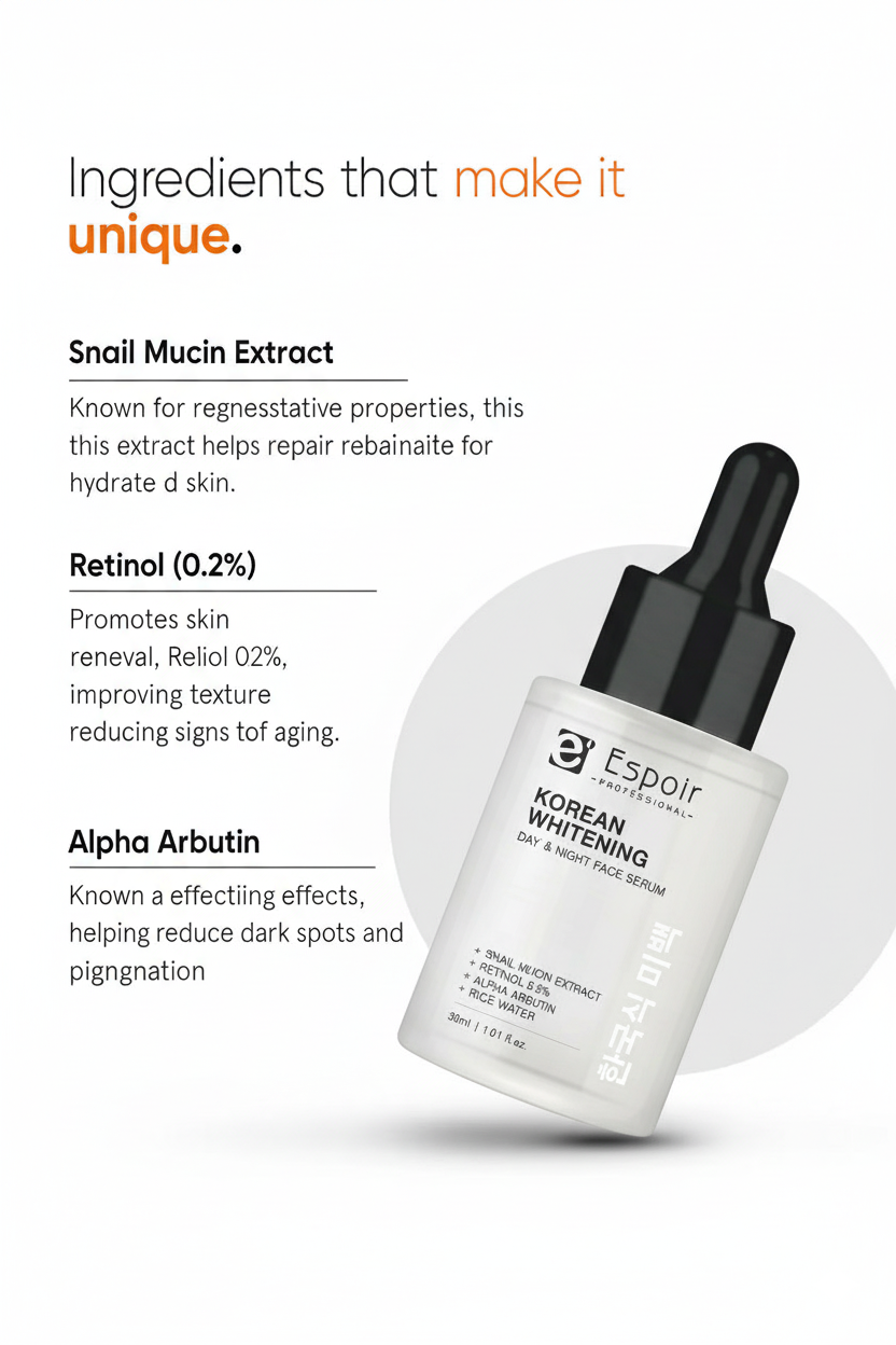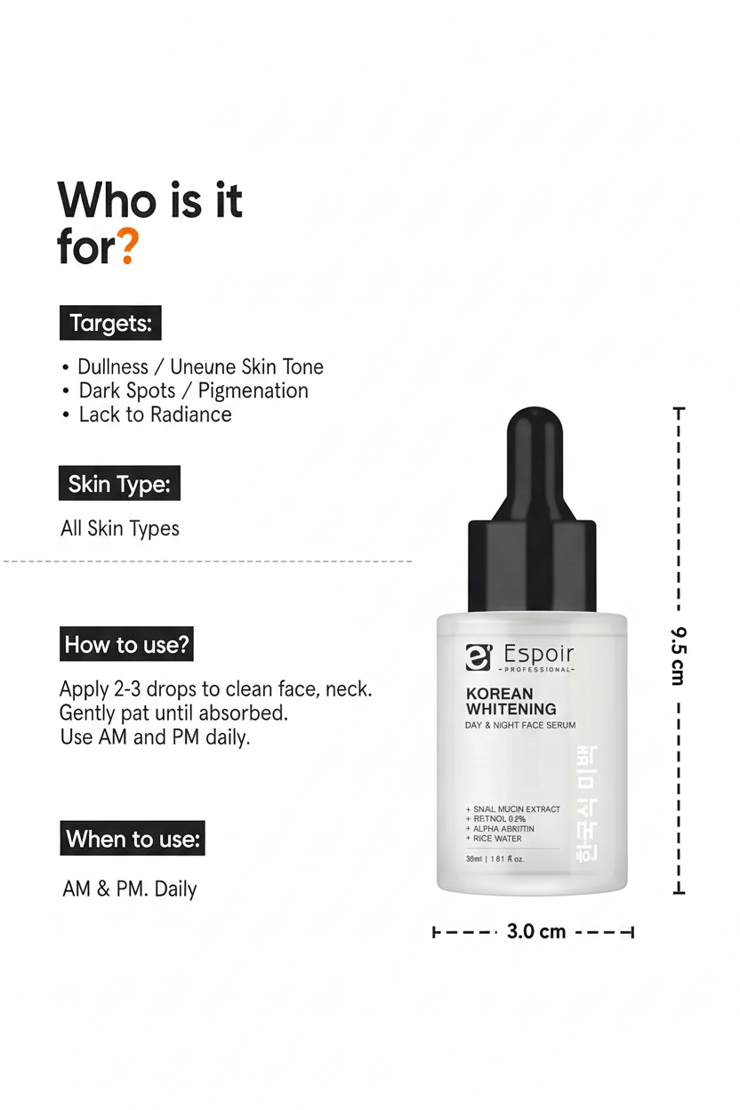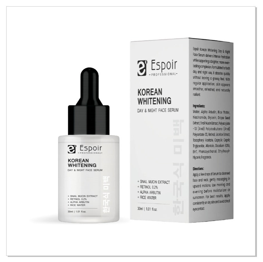 Espoir Korean Whitening Day & Night Face Serum offers powerful hydration and supports a brighter, more even skin tone. Its lightweight formula is designed to absorb quickly without leaving a greasy feel, making it ideal for use both day and night. With regular application, this serum leaves your skin smoother, refreshed, and naturally radiant.